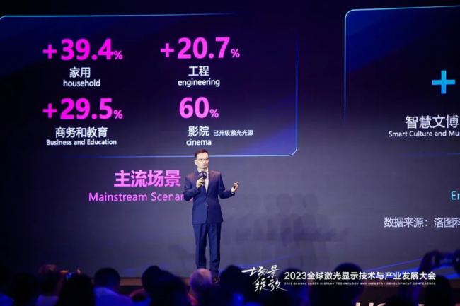 中國激光顯示場景化全域崛起 。主流應用場景家用、工程、商務、教育在2023年上半年繼續高歌猛進,分別收獲20%-40%的同比增長;未來,激光顯示還將在醫療、虛擬顯示、航空、車載等等領域以嶄新的形態發揮更大的潛力。