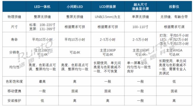 在以上顯示技術的比較之下,LED顯示產品存在一定優勢:一、LCD拼接屏的物理拼縫相對較大,影響觀感,其和LED顯示競爭的主要場景在監控領域。二、超大尺寸液晶顯示屏在尺寸方面受限,目前最大尺寸不超120寸,而LED顯示屏可根據需求尺寸進行拼接。兩者目前在會議場景的應用競爭不明顯,LED顯示屏主要用于超大型及大型會議室;而超大尺寸液晶顯示屏主要用于中小型會議室。三、投影儀設備尺寸雖然也可根據需求融合拼接,但壽命較短,而LED顯示屏的壽命可達10萬小時;相對來說,投影儀和LED顯示在會議場景的競爭較為直接和充分。